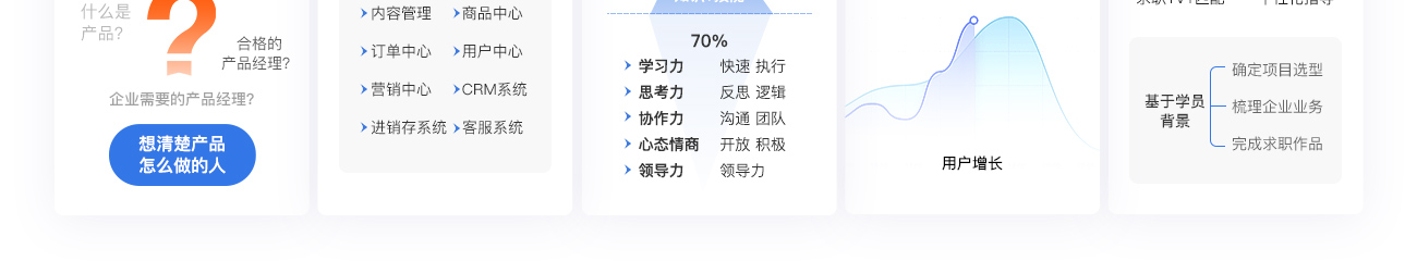 新增后臺基礎,產品運營、P2P項目、區塊鏈行業拓展, 拓展學員產品行業認知,懂產品也要懂運營,課程從產品基礎到電商前后臺,產品運營和行業拓展,打造全能型產品經理,將理論與實戰相結合,每個課程模塊結束都以項目實戰結尾,以學員懂理論會操作為課程目標。
